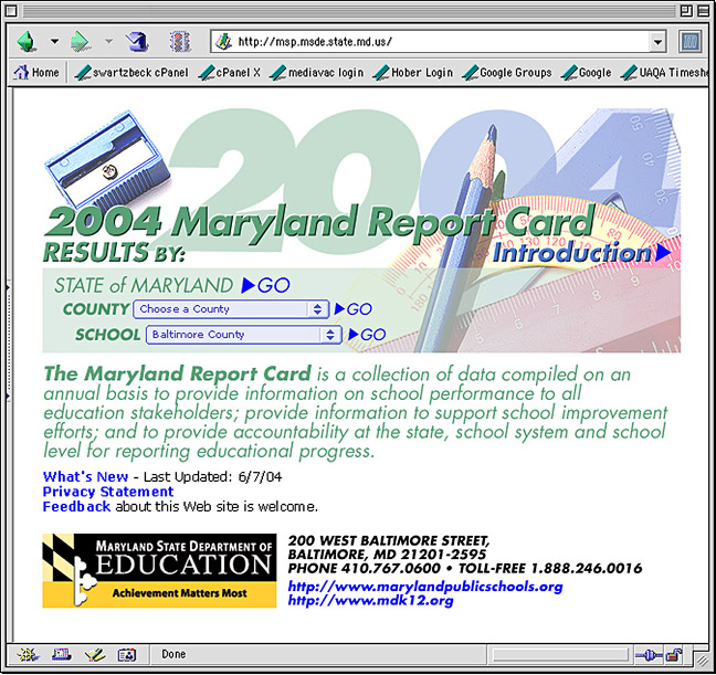 18: Maryland Report Card, Web design, 2004 As a companion to their "School Improvement" Web site, the Maryland Department of Education publishes this interactive report card for the state's schools which allows viewers to analyze and compare educational data in a variety of ways. |